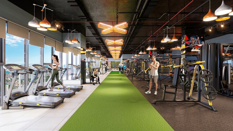 - Phòng gym hiện đại với trang thiết bị nhập khẩu, không gian mở và đầy đủ các khu chức năng từ cardio đến weight training.